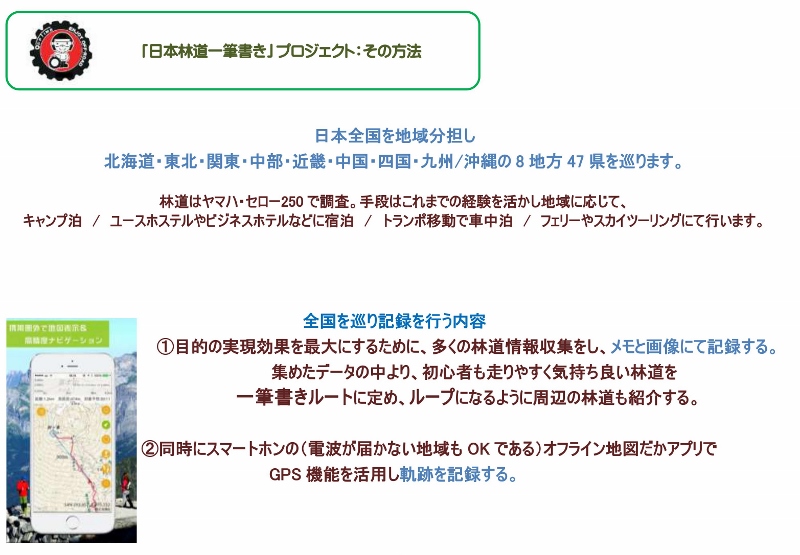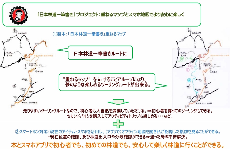 そこで、オフロードを体験できる林道ツーリングを、 もっと気軽により安心して楽しむ仕組みがつくれないだろうか。 そんな想いを込めて企画いたしました。