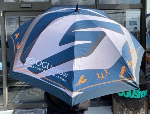 イベントで、ハイエースをトラックに架装したトランポで皆さまの最終を走り、トラブル対応を行っていただきます「OGUshow」さまより、大きめに製作されたオグショーアンブレラ3本をご提供頂きました! |