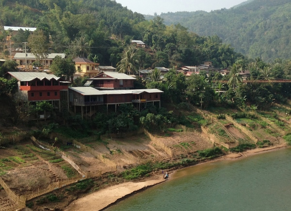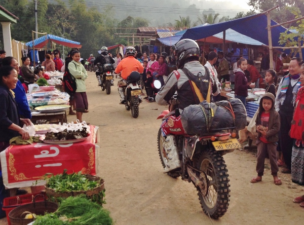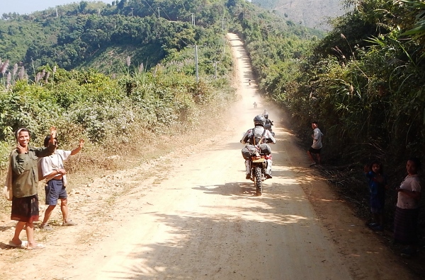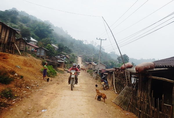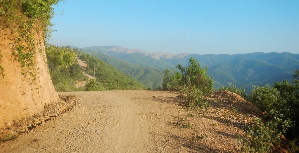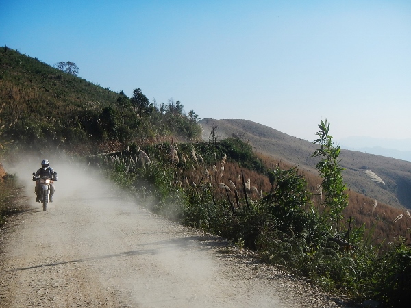 ナムウー川を眺めながら食べていると、対岸の山肌に大きな木材を運ぶトラックが見えた。中国経済が好景気な影響も大きいようで、伝統的な焼き畑をやめゴムの木などの産業植林が拡大し、人びとの生活も変わりはじめているようだ。のんびりと朝食を食べて出発。ホテルを出るとすぐにダート。仲間が見つけてきてくれたルートへ向かう。