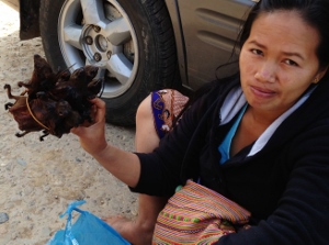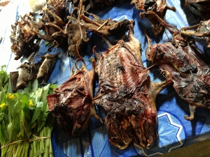 旬の野菜に山菜、カエルや獣鳥肉のイタチやリス。日本では天然記念物のヤマネコに似たネコ科の動物も並んでいる。ムアンクア市場でもコウモリやネズミの日干しを初めて目にしたときは、かなりひいた私も、今ではその町の自然や食習慣が見えて面白くなっていた。ここではウドムサイ県の自然の恵みが並んでいる。