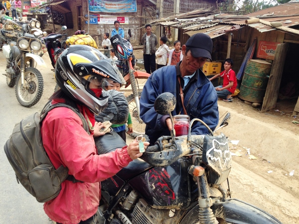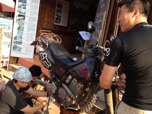 この日は、明日から始まるツーリングに備え、ツアー会社の店先でバイク整備をする。