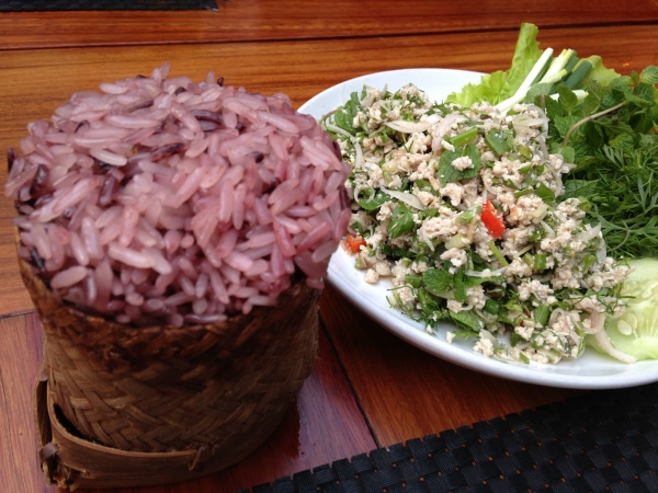 《Photo/ラオスの主食はもち米。もち米でできた甘いスイーツまである。ちょっと高級なレストランでは赤米がでてくる。左手でつまみ、少しこねるようにして丸めて食べる》