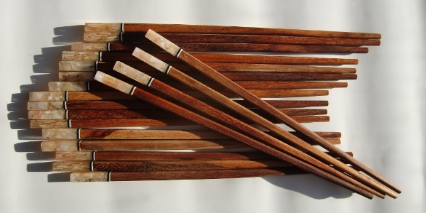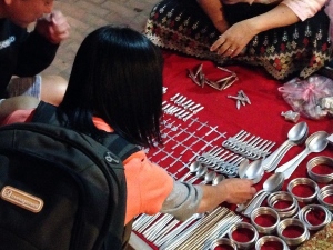 《Photo/ナイトマーケット。戦渦に巻き込まれたラオス。不発弾のスクラップ回収で作られたスプーンやお箸などの販売もしていた。木製のお箸もいろいろあって、模様や装飾がほどこされた綺麗なデザインのもので1膳100円ほど》