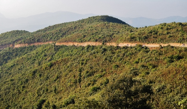 村を後に、ラオスの山並みを眺めながら稜線をひたすら走る。ロケーションは抜群だ。