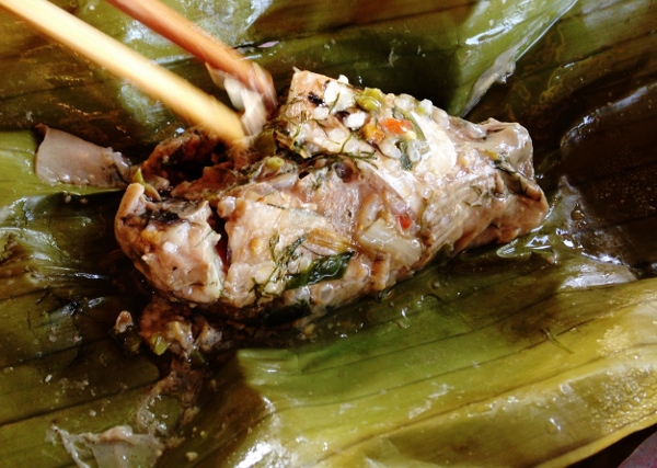 《Photo/バナナの葉で包まれた魚の中に、パクチーと唐辛子を詰めて麹で発酵させたもの。生臭い強烈な匂いで、口の中が凄いことに》