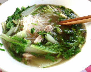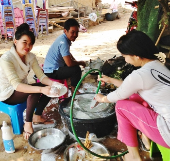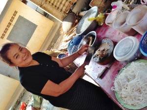 ここでヌードルの「フー(feu)」を食べる。ベトナムのフォーやタイのクイッティアオのような米粉の麺と同じだけど、フーはコシがなく細い。スープの味は薄い。その中に半生の白菜とパクチーと少しの牛肉が入っている。これに、誰も食べなかったが(5人分の)トッピング用のパクチーとパセリがドサッとザルに盛られて、日本円で1人前80円くらい。空腹感は満たされ幸せだ。