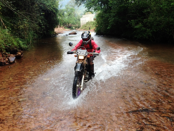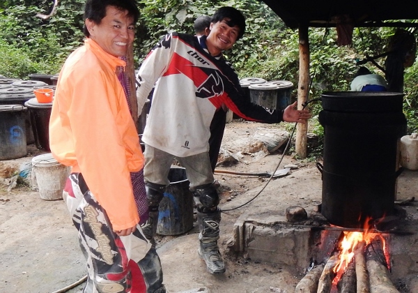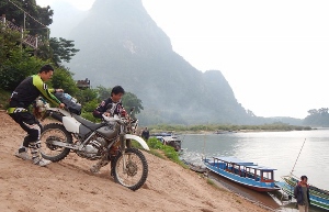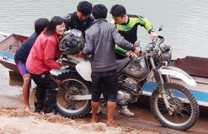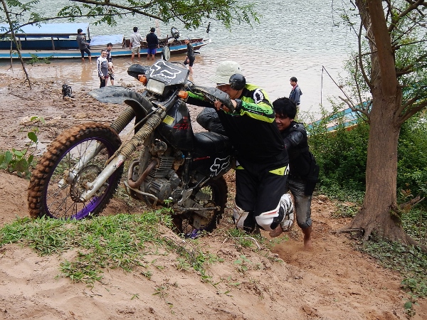 船着場には見えない川の浅瀬でエンジンを切る。ボートから水上へバイクを下ろし、ブーツもモトパンも脱いで崖下まで押し、山肌の急斜面を体格のいいゴーさんとニャイの2人で勢いを付け押し上げるという流れになった。