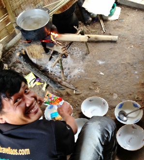 ガソリンを給油し再び一般道のダートへ。1時間走り、ランチは学校の前のお店でインスタントラーメンを買って、お店の炊事場を借りて作ってくれた。