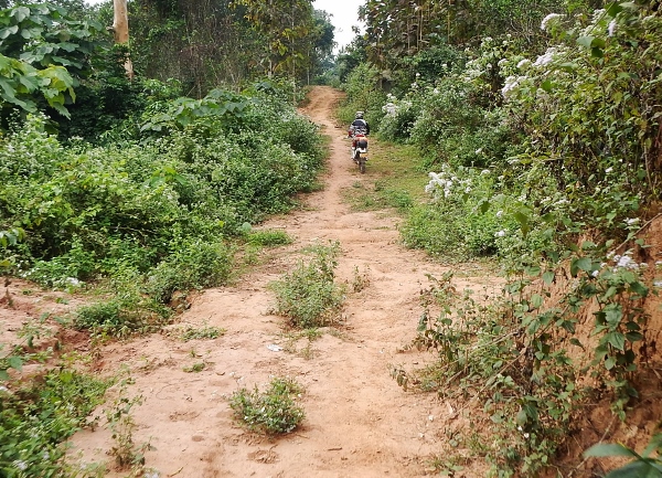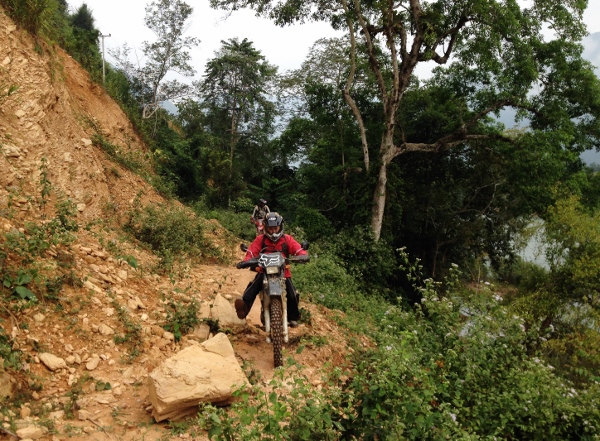 崖の上にバイクを上げ終わると、バイクがやっと通る幅の崖っぷちを走る。左に倒れたら落ちてナムール川へリバースだったが、皆無事に村へたどり着いた。