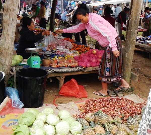 市場には、野菜、魚、肉、のほかにも珍しいお惣菜に、コウモリやネズミや虫などの食材も並ぶ。日用雑貨は中国やタイ製品が無造作に積まれ、伝統の文化も変わりつつあるようだ。