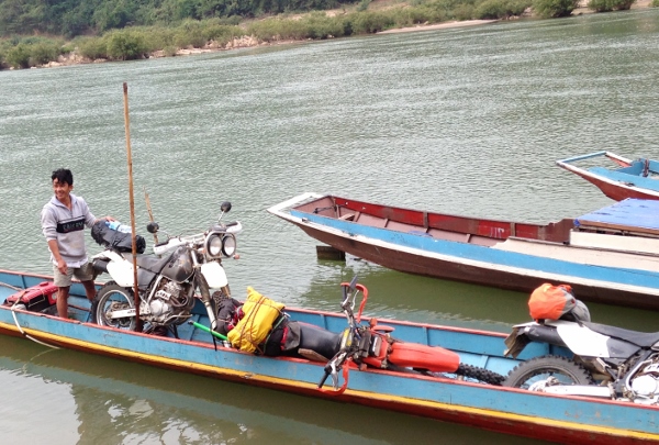 出発の時間になりバイクに跨る。この日はメインストリートで開かれる朝市の間を縫ってのスタートだ。ワットオカート寺院の横を通り、朝霧が立ちこめる船着場へ。フカフカの砂浜にバイクを止め、川に浮かぶエンジンボートのギリギリまでバイクを押す。