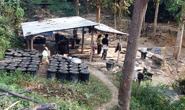酒造所とはいっても屋根しかなく、ドラム缶と黒いバケツが地面に並んでいるだけ。もち米をフタ付きの黒いバケツに入れて発酵させてドラム缶で蒸留するそうだ。