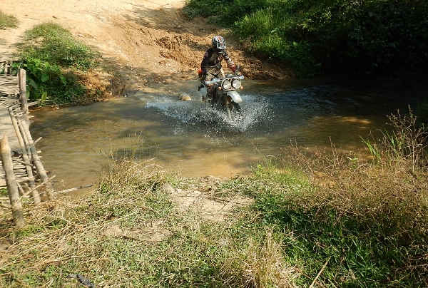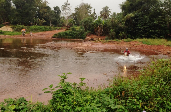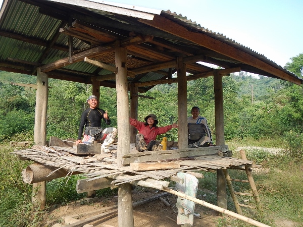 途中には5~6mほどの短い川を3回渡る。乾季だからラクに渡れる川だが、雨季だと流れが早く、バイクのエンジンを止めて皆で押して渡ったらしい。3回目の川を渡ると高床式の民家と高床式の東屋があって、ここで休憩。高床式は雨季の洪水対策にはベストだろうし、暑さもしのげ、見た目にも涼しげなのがいい!