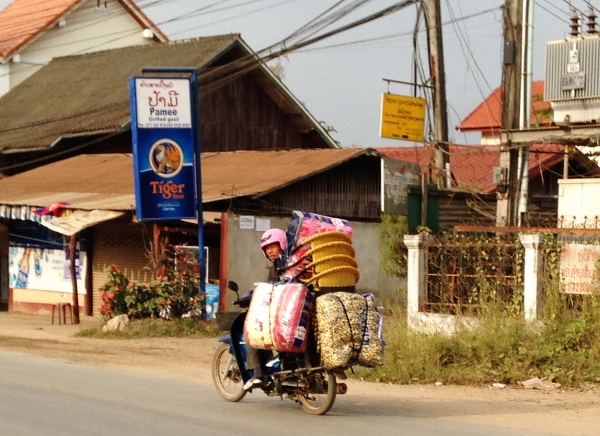 町で普通に見かける沢山の布団を積んだバイクに、山岳のコーナーですれ違い、ハッとしたこともあった。でもなんてことはない、ラオスでは一般道だ。