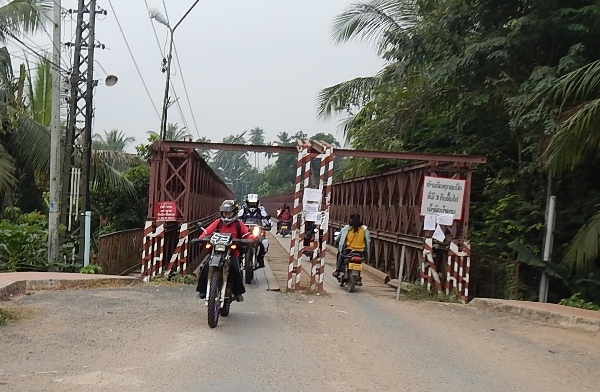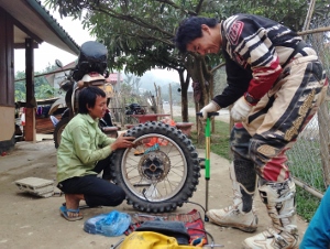 国道2E号線から離れ、まずは昨日見かけたバイク修理店へ行く。工具を借りてバイク6台のまし締めをする。