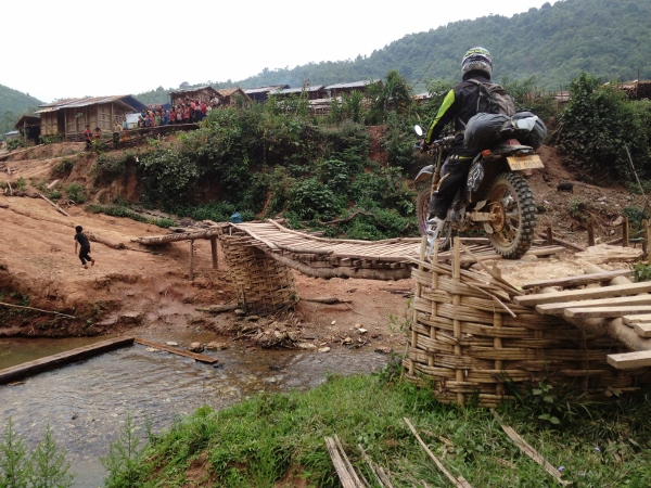 学校を後に再び森林地帯へ。1760mの峠を越え2時間走り、壊れそうな長さ25mくらいのバンブーブリッチを1台ずつ渡ると、少数民族が住む村に着いた。